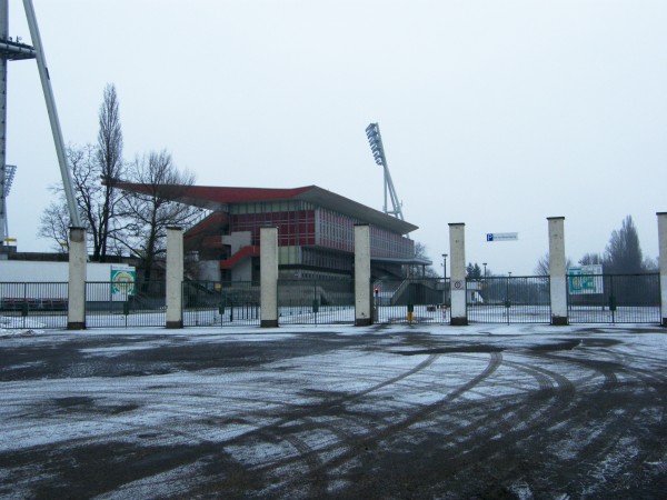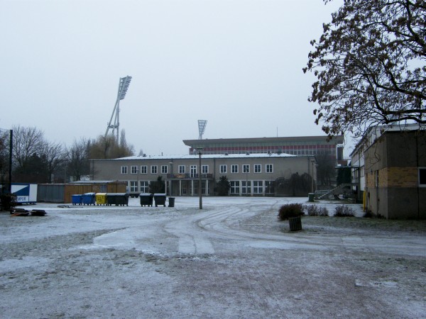Haupteingang zum Jahnsportpark in der Eberswalder Straße mit der Haupttribüne. -